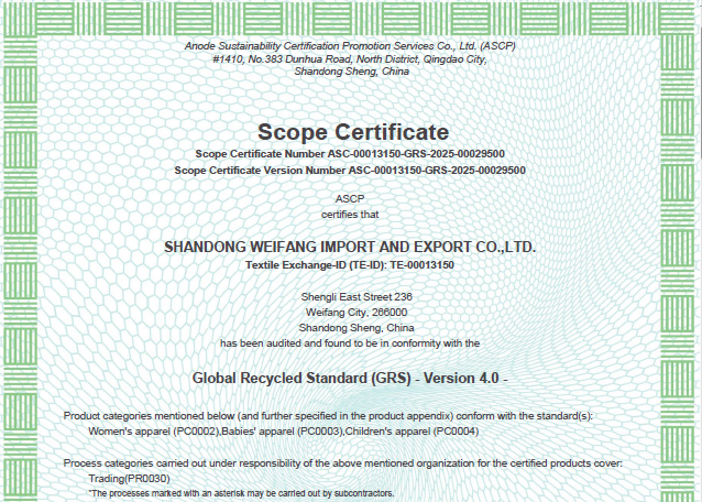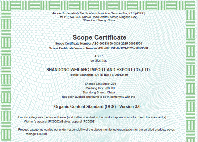 公司自營和代理服裝、食品、五金、化工、機(jī)電等各類商品及技術(shù)的進(jìn)出口業(yè)務(wù),公司有專門的生產(chǎn)、加工基地,并通過了Oeko - Tex Standard 100、GRS、OCS、RCS、USCTP等多項(xiàng)認(rèn)證,可以按客戶要求設(shè)計(jì)生產(chǎn),同時承辦中外合資經(jīng)營、合作生產(chǎn)、開展“三來一補(bǔ)”以及技術(shù)輸出、易貨、邊境貿(mào)易等業(yè)務(wù)。公司產(chǎn)品出口到日本、法國、俄羅斯等50多個國家或地區(qū)。